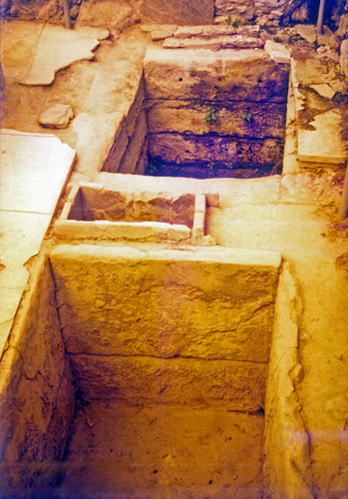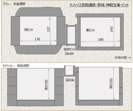 | サンプル・ページ:(抜粋) ---------- ![]() 遺跡:クノッソス宮殿遺跡・西翼部・王座の間コンプレックスThrone Room Complex ・左=中央大階段Central Staircase ・右=控えの間Waiting Room〜王座の間Throne Room(壁面=復元) ・手前=中央中庭Central Court ・二階=フレスコ画の部屋Room of the Fresco(復元) ・三階(復元) 年代:MMIII期〜LMIIIA1期・紀元前1625年〜前1375年 現地:クレタ島・中央北部/イラクリオン市街地〜南南東5km 描画:(1982年時点)大久保栄次 GPS:35°17'53''N 25°09'47''E/標高95m ミノア王の執務室・「王座の間」 西翼部一階、控えの間の奥(西側)に配置されたミノア王の執務室、王座の間Throne Roomは、予想に反して決して大きな部屋ではない。石膏石で舗装された王座の間では、東側(控えの間側)を除いて、北〜西〜南側の壁面に沿って部屋を3/4周するように石膏石製のベンチが設けられ、北側には3,400年以上前にミノアの歴代の王が実際に座っていた石製王座が南向きに据えられている。 125年前、エヴァンズの発掘ミッションでは、王座の間付近の発掘時の地表面は、王座の背もたれ上端より約50cm上方であった。そして紀元前1375年頃、大火災によるクノッソス宮殿の最終崩壊で焼け焦げた石製ベンチは、ミノア時代のまま地中に残存、部屋の壁面は崩壊状態であった、とされる。 ![]() 遺跡:クノッソス宮殿遺跡・西翼部・王座の間コンプレックス・プラン図 参考情報:Cambridge U. (UK) Online-data 現地:クレタ島・中央北部 作図:大久保栄次 王座を挟んで向かい合う想像上の動物であるグリフィンGriffinやパピルスPapyrusなど、和色で言えば緋色〜茜色を基調とする西〜北側のフレスコ画の装飾は、1913年と1930年、エヴァンズとスイス人の考古学美術家エミール・ジリエロンにより、コンクリート壁面に復元されたものである。 専有面積は決して広いとは言えないが、王座の間の全体イメージでは、先史時代の東地中海域で最も繁栄したミノアの王国、その最高統治者たる王の執務室としての神秘性と権力の威厳さを感じることができる。 ![]() 遺跡:クノッソス宮殿遺跡・西翼部・王座の間Throne Room (現在 立入禁止区域) ・火炎跡の石膏石製王座&石膏石製ベンチ&石膏石床面=ミノア文明の遺構 ・王座=地中海域で「最古の王座」 ・王座の間の北〜西〜南側に設置された石製ベンチに座れる人数=16人分 ・王座を挟む北側ベンチ=宮殿最高位の官僚達が座る ・王座の両脇 グリフィン鎮座のフレスコ画の壁面=サー・アーサー・エヴァンズとスイス人考古学美術家エミール・ジリエロンによりコンクリート復元(1913年&1930年) ・王座の前=ミノア文明の大型石製水盤は置かれていない 年代:MMIII期〜LMIIIA1期・紀元前1625年〜前1375年 現地:クレタ島・中央北部 撮影:1982年 宮殿の「聖なる宝庫Temple Repositories」、聖域・石製ベンチの控え室の北側の位置 控え室の北西端の石製ベンチの左側ドアー口から北方へ入ると、石膏石で舗装された二つの小さな部屋がある。この場所こそが、クノッソス宮殿を、あるいは過激に言ってしまえば、ミノア文明を象徴するに値するリュトン杯など、無数の宗教関連用品と宝飾品が眠っていたクノッソス宮殿の「聖なる宝庫」の区画である。 ![]() 遺跡:クノッソス宮殿遺跡・西翼部・聖域(現在 立入禁止区域) ・一階レベル・プラン図 現地:クレタ島・中央北部 作図:大久保栄次 神殿宝庫の構造 かつて先史ミノア文明では、「王=神」と崇められ、王の住む「宮殿」は「神の住む神殿Temple」と同じ意味を成したことから、発掘者エヴァンズを初め考古学の研究者から、「宮殿の宝庫Palace Repositories」は「神殿の宝庫Temple Repositories」と呼ばれてきた。 石製ベンチの控え室の北側に配置された奥の部屋が、クノッソス宮殿の宝飾品の保管庫であり、研究者に「神殿宝庫」と呼ばれる場所である。 ![]() 遺跡:クノッソス宮殿遺跡・西翼部・神殿宝庫(現在 立入禁止区域) ・奥側=西側の深い大型収納ピット ・中間=後世の浅い小型収納ピット ・手前=東側の深い大型収納ピット 年代:MMIIIA期〜LMIIIA1期・紀元前1625年〜前1375年 クレタ島・中央北部 撮影:1982年 ![]() 遺跡:クノッソス宮殿遺跡・西翼部・神殿宝庫 ・発掘後の神殿宝庫&出土した容器類 写真情報:サー・アーサー・エヴァンズ発掘レポート The PALACE of MINOS at KNOSSOS v. I (1921) 神殿宝庫には東西に少し離れて二か所、方形の深い大きな地中収納ピットがあり、その壁面は厚い石膏石の平板が四段に積み重ねられ、石膏石板を敷き詰めた構造の底部と組み合わせ、堅固な箱状に形容されている。 収納ピットの大きさの詳細は、中央中庭側の東ピットが東西幅190cm、南北幅143cm、深さ152cm、そして貯蔵庫群の長い通廊側の西ピットは東西幅176cm、南北幅137cm、深さ150cmである。 容積では、東ピットの方がわずかに大きく、発掘の結果として東ピットの方が西側より出土した宝飾品の点数も多く内容も豪華であった。この事実から、エヴァンズを初め多くの研究者は、東ピットはその東隣の三分割聖所と深化の関わりがあった、と判断している。 ![]() 