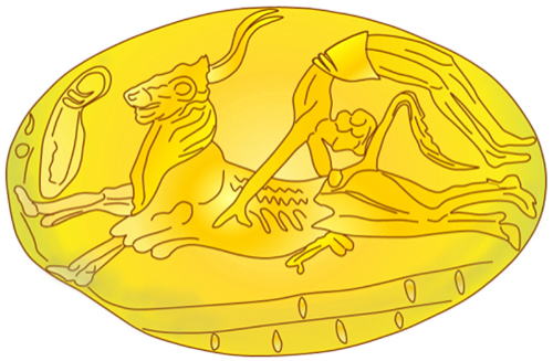 | サンプル・ページ:(抜粋) ---------- I-1-01 金製リシグネットング 《Gold Ring of King Minos》 ![]() 出土遺跡:クノッソス地区 王家の墳墓Temple Tomb (現在 立入禁止区域) 表現:金製シグネットリング/エピファニー表現・女神・祭祀王・聖所・雄牛角U型 年代:MMIII期~LMIB期・紀元前1600年~前1450年 展示:HAM/重さ約30g 現地:クレタ島・中央北部 描画:大久保栄次 Sir Arthur John Evans により《ミノス王の金製シグネットリングGold Ring of King Minos》と呼ばれた金製リングは、1928年、クノッソス地区の10歳の少年Michalis Papadkisが、王家の墳墓Temple Tombのわずか10mほど南方の耕作地の地表面で見つけた、とされている。 その後、70年あまり金製リングは行方不明となっていたが、ギリシア政府が取得、ミノア文明の「本物」と確定した結果、2002年7月以降、イラクリオン考古学博物館HAMの「至宝」の一つとして展示公開されている。 インタリオ彫りの微細で精緻加工が特徴の、この金製リングのモチーフはエピファニー表現 Epiphany であり、極めて尊貴な人物と女神、聖なる樹木の山頂聖所と神殿、聖なる雄牛角U型オブジェや特徴ある高貴な舟など、非常に高尚にして厳粛な宗教的なシーンが印面に隙間なく刻まれている。 金製リングの製作は「花ほとばしる新宮殿時代」の前半、中期ミノア文明MMIII期~後期ミノア文明LMIB期・紀元前1600年~前1450年である。 I-1-02 金製シグネットリング 《イソパタ・リング Gold Isopata Ring》 ![]() 出土遺跡:イソパタ遺跡・王家の墳墓・横穴墓1号墓 表現:金製シグネットリング/エピファニー表現・女神・ヘビ・踊る女性達・スミレ花の草原 年代:LMI期・紀元前1550年~前1450年 展示:HAM・登録番号424/横L26mm 現地:クレタ島・中央北部 描画:大久保栄次 北方向へ延びる55m以上、長い通路ドロモスを備えたイソパタ遺跡Isopata・王家の墳墓・横穴墓1号墓の前室と埋葬室の側面は、完璧に切石組み施工された堅固な仕様であった。 正方形の埋葬室の南東側床面に「L字形」に掘削された深さ約1.7mのキスト墓があり、中から女神と二匹のヘビが見守る中、四人のミノア女性達がダンスに興じる情景を描写した、ミノア工芸美術の最高傑作の宝飾品の一つ、素晴らしい金製シグネットリングが出土した。 ミノア風の厚ぼったいスカート姿の女性達、左側の二人と中央の女性は髪飾りとロングヘアが揺れていることから「若い女性」、右側の女性の髪は結ってあることから三人より少し「年上女性」であろう。四人の周囲にはスミレの花が咲き乱れることから、時期は春の頃、場所はクノッソス宮殿の南方のジプサデスの丘など草原である。 この金製シグネットリングの所有者(被葬者)は、ミノア文明の最も繁栄した平和で豊かな時代、クノッソス宮殿に住んだミノアの王妃、または可憐な王女、高位貴族など尊貴な女性であった。その製作は「花ほとばしる新宮殿時代」の最盛期、後期ミノア文明LMIA期~LMIB期・紀元前1550年~前1450年とされている。 I-1-04 金製シグネットリング 《雄牛跳び》 ![]() 出土遺跡:アルカネス近郊・横穴墓 表現:金製シグネットリング/逆立ち姿勢のミノア青年の《雄牛跳び》 年代:LMII期~LMIIIA1期・紀元前1450年~前1375年 展示:Ashmolean Museum, U. Oxford (UK) 登録番号AN1896-1908-AE2237/横L34mm Sir Arthur John Evans 寄贈 現地:クレタ島・中央北部 描画:大久保栄次 クノッソス宮殿遺跡~南方7km、アルカネス近郊Archanesの横穴墓の発掘では、Sir Arthur John Evansがミノア文明の工芸モチーフの代表格である「雄牛跳び」を写実的に刻んだ、印章タイプの金製リングを見つけている。横34mm・縦22mmの楕円形(オーバル形状)の金製リングは、かつて自身が館長を務めた Evans が、オクスフォード大学・アシュモレアン博物館Ashmolean Museum, U. Oxford (UK)へ寄贈したものである。 金製シグネットリングのやや凸状の印面には迫力ある雄牛跳びのシーン、短めの巻き毛のミノア青年が疾走する雄牛の背上で逆立ちする姿をインタリオ彫りで表現している。弓なりで腰巻姿の青年の両足は、雄牛の尾を越えて風圧で雄牛の後方へ延び、右腕は雄牛の浮き出た肋骨(あばらぼね)付近、左腕は背骨に置かれている。 表現は極めて動的なシーンでありながら、変化する動きの一瞬を切り取って刻んだ素晴らしい作品である。その製作は「新宮殿時代」の後期、後期ミノア文明LMII期~LMIIIA1期・紀元前1450年~前1375年とされている。 I-2-10 ネックレース 「金製ビーズ・緑ジャスパー」 ![]() 出土遺跡:アルカネス遺跡・フォウルニ共同墓地・トロス式墳墓Γ 表現:金製&象牙ビーズ・ネックレース、トップ=緑ジャスパー 年代:EMIII期・紀元前2200年~前2000年 展示:HAM 現地:クレタ島・中央北部 描画:大久保栄次 アルカネス遺跡Archanes・フォウルニ共同墓地のトロス式墳墓Γ(C)は、メッサラ様式の円形墳墓と同様な構造を成し、埋葬のトロス部は比較的小さく内径3.6mであった。 トロス内部で確認された11基のラルナックス陶棺と多くのピトス容器の陶棺、さらに墳墓入口付近を含めた床面に安置された遺体を含め、合計50体以上